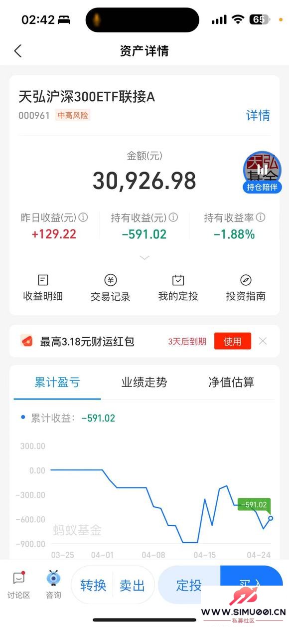 从3月24建仓到目前,天弘沪深300的跌幅都在预期之内,也算比较扛揍,在A股这个乱市之中尚有保命的手段,可以说是非常稳定了。另外把部分资金放在了东方红,希望这只可以平衡住跌幅。剩余的几千放在了新基中,看看运气如何。马上到月尾了,又多了15000的投资金,打算布局在房产上。目前房产非常低迷。很多基跌幅超过50%。我认为是抄底的好时机,等我挑选好,打算投资10W左右 |