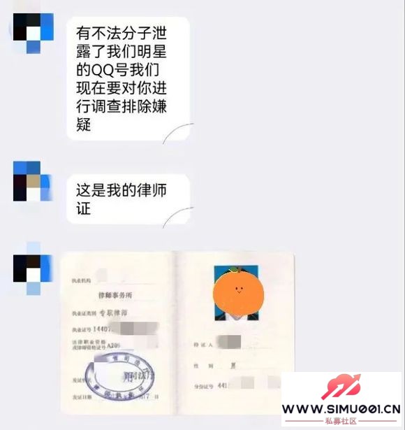 # y" I( _4 O& \9 f/ T. s诈骗分子冒充明星或经纪人的身份,诱导未成年人加好友,之后谎称自己是某某明星律师,以“明星的账号隐私被泄露”等为由,恐吓未成年人支付相应费用或提供个人信息。