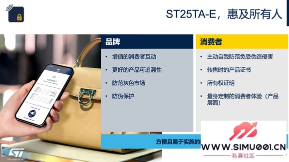 ST25TA-E专为实物产品认证而设计,能够为品牌方提供增值的消费者互动,比如更好的产品可追溯性,防范灰色市场,达到防伪保护的目的。同时也能为消费者提供很多价值,如主动自我防范免受伪造侵害,转售时的产品证书、所有权证明,以及量身定制的消费者体验(产品层面)。3:220 R9 ^4 c) q ` m