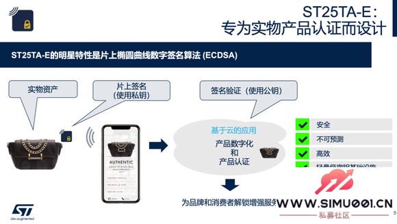 0 J) Z) s0 j, P% qST25TA-E 新增的片上数字签名机制基于椭圆曲线密码加密算法(ECC),运行在ST25TA-E内嵌的高级非对称加密引擎上,保证贴该标签的实物产品是原厂正品。新NFC标签芯片ST25TA-E NFC tag全面防范假冒产品和灰色市场交易,增加与消费者沟通交流的机会。