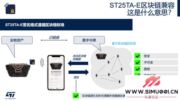 在基于区块链的应用中,区块链技术原生支持Edge TruST25 数字签名,确保数据的不变性和透明度。ST25TA-E通过结合NFC和区块链技术连接现实生活与数字生活,实现强大的认证/简单的实施。NFC技术提供可互操作,简单、直观、安全,便于集成。区块链则具有透明、不可变、安全、去中心化的特点。$ L8 O7 Y$ @/ u; E+ e% Z3 l: _