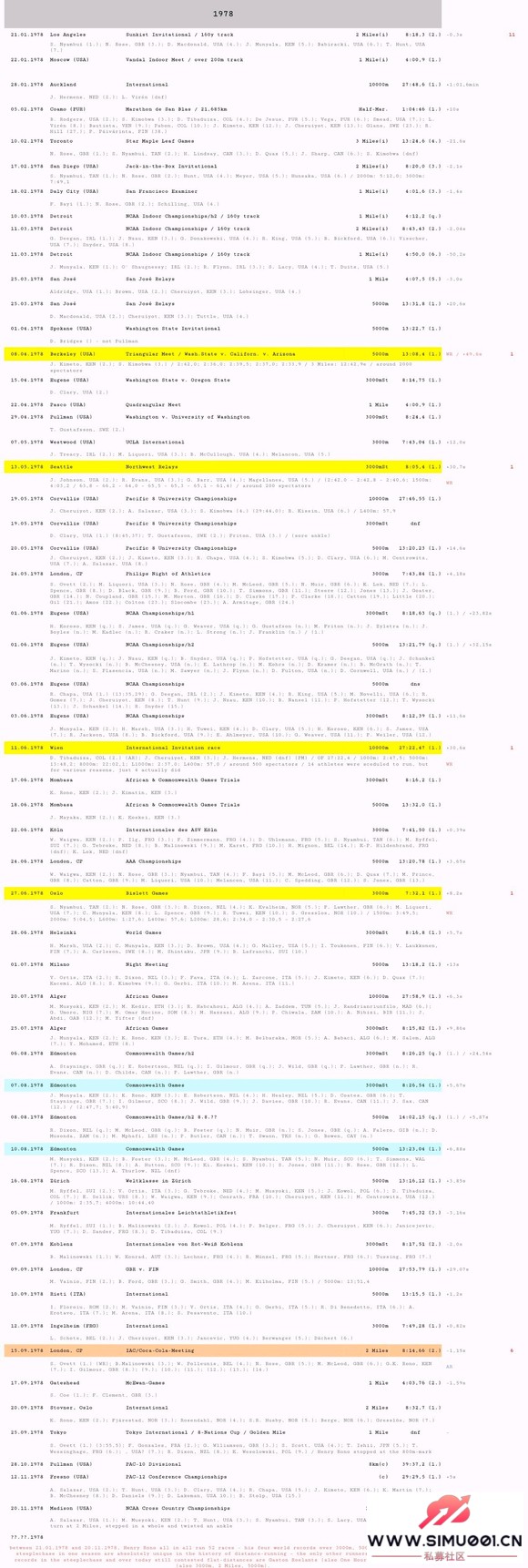 亨利·罗诺(1952-2024)当时世界长跑超巨,他在1978年4月8日-6月27日的81天内连续打破了四项世界纪录(5000m,3000mst,10000m,3000m)震惊世界体坛,他单赛季参加共55场比赛,赢得了其中44场,其中3月-9月间取得了28连胜,所向无敌,人们把1978年称之为“罗诺年”" W, I0 `8 I# Z. O; v- G. @( j0 E