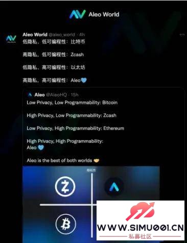 . M# q4 p' S. L6 O今天,我们要介绍的项目Aleo,正是位于第一象限的佼佼者。Aleo是首个利用零知识证明技术,同时解决隐私问题并保持高度可编程性的公链。( _ Q5 G, J9 j/ r$ u