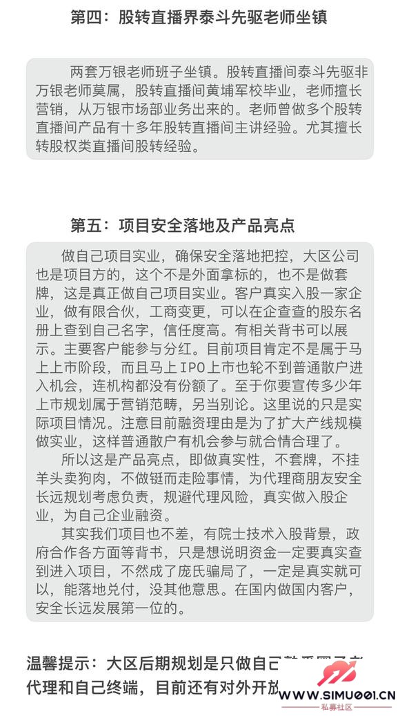 9 _3 F1 E* C! x做自己项目实业,确保安全落地把控,大区公司也是项目方的,这个不是外面拿标的,也不是做套牌,这是真正做自己项目实业。客户真实入股一家企业,做有限合伙,工商变更,可以在企查查的股东名册上查到自己名字,信任度高。有相关背书可以展示。主要客户能参与分红。目前项目肯定不是属于马上上市阶段,而且马上IPO上市也轮不到普通散户进入机会,连机构都没有份额了。至于你要宣传多少年上市规划属于营销范畴,另当别论。这里说的只是实际项目情况。注意目前融资理由是为了扩大产线规模做实业,这样普通散户有机会参与就合情合理了。9 a! e6 F! s$ M! t: ]) ? i% A