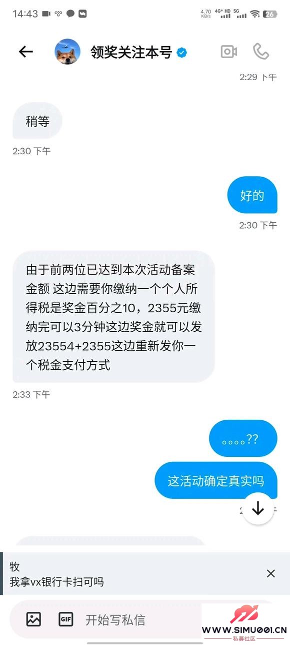 是这样的 鼠鼠平常喜欢逛逛推特,关注国家大事,突然一个很早之前关注过的皇推私信我说我被抽中当幸运粉丝了,现在交798买两双鞋子就可以参与最低2888元的抽奖,当时鼠鼠感觉不对,但是还是上当了,因为看着她推特15w和抖音30w的粉丝我选择了相信,然后800转过之后又让转2350元的税金,当时800都给了 你们不懂那种感觉。。。就是完全上头了。。希望最后能拿到奖 不出意外的全部被骗走了 现在想起来还要打自己嘴巴子 不知道能不能追回钱款,明天去报警,已经知道的信息就是这个人的抖音账号还有蓝v认证的推特账号。还有我所打款的江西公司。。。。