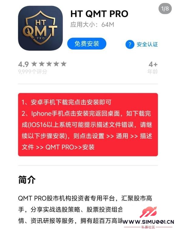 + J) ~) S+ i0 T$ X2 h& z# o- Z1图7),名叫【HTQMTPRO】,我是到这一步意识到这是诈骗的。这个APP打开后里面看起来是一个炒股APP(图8),但是没有任何开发者信息,后面他会让你在这里做实名认证什么的。