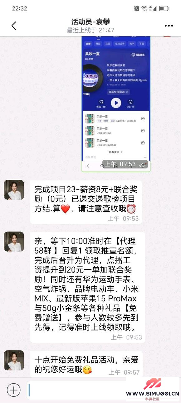 + ~! k& q' {) V7 a+ z5 m可能是拿人手短,居然同意了下载APP。它的APP估计是机器人在操控,很多人在群里说话,都是各种中奖了,首先是点歌推热成功得返利,然后就是各种中奖活动。# b( U) k& L' i# O