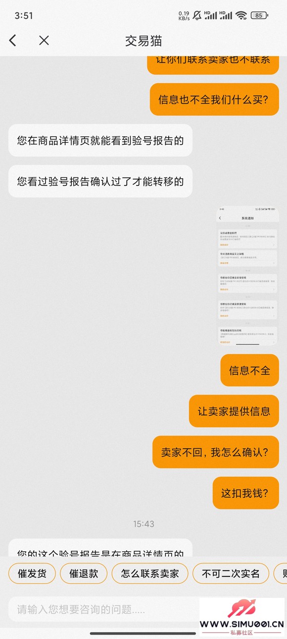 现在某猫推出了个新的功能叫诚意金,就是你先付钱议价,卖家同意后你再决定是否购买。结果卖家同意你下单后是没有客服对接的,就是账号就是你看到的那个界面,有很多地区服的账号,不会给你说明可垮的区服,俗称坐牢号。简单来说就是,你30min内不确认收货的话,平台和卖家会一起“瓜分”这笔钱,但平台会说已验号界面为准,整笑了,花钱买个教训吧,提防某猫。
