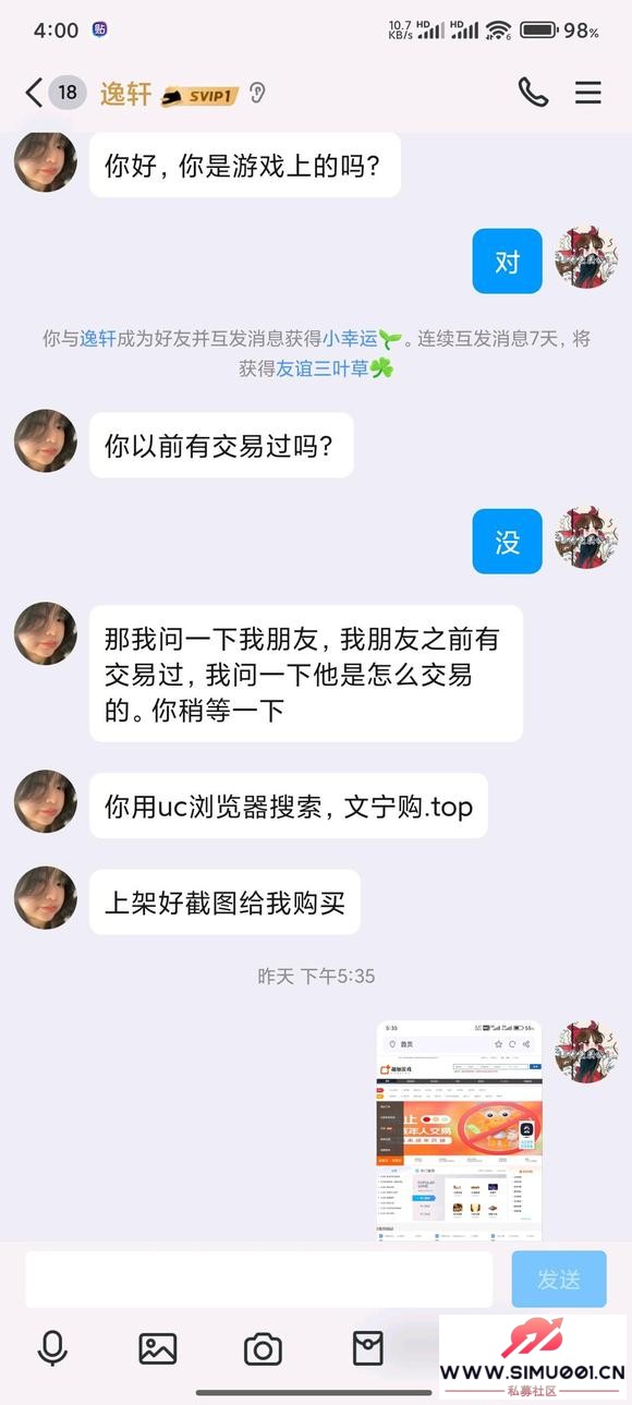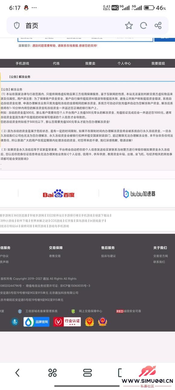 简单来说就是有人要买我的游戏账号,让我上一个叫文宁购.top的平台我看是腾讯的,就没多想交易完成后资金就被冻结了,要交同样的钱,到这我就知道是诈骗了! M6 R0 g9 A `+ r% o* P
