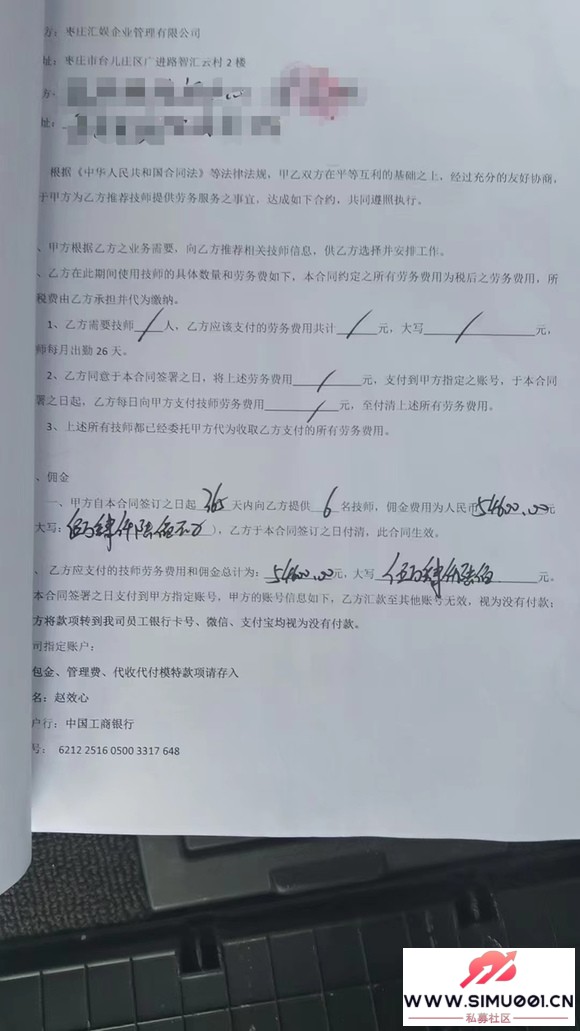 * y) A( H1 t* R0 k8 c5 m7 h我和山东枣庄汇娱企业管理公司的业务员联系,得知他们公司有很多从事95服务的年轻漂亮技师,并且业务员发给了我许多她们的照片。之后,他们邀请我前往公司考察,并相约我选定人选。当我到达公司后,他们要求我支付3000元的诚意金,然后第二天会安排技师过来。第二天,公司安排了一群年轻漂亮、身材火辣的技师前来,声称这些人都是做95服务的,而且都有丰富的工作经验。我们支付了费用后,人就可以马上带走。当时感觉这样子不可能会被骗,于是我支付了54600元费用。同时,我还带走了两个技师,因为我是自己开车去的,坐不下那么多人,其他人要第二天才会安排过来。而且这两人没有带任何行李,来的当天下午就直接消失.剩下的技师并没有如约前来,公司随后开始找各种理由解释这一事件。然而,剩下的技师也没来,过了几天,山东枣庄汇娱企业管理公司终于露出了他们诈骗的本质,声称公司也联系不上这2个技师,然后推荐另外一批技师给你。并且日保工资要1200起,不管年龄颜值和之前在现场看到的技师都是天壤之别,并且要求日保工资要1200起。在之后的交涉中,该公司的鲁总亲口承认,公司找来面试的技师都是高价找的托。