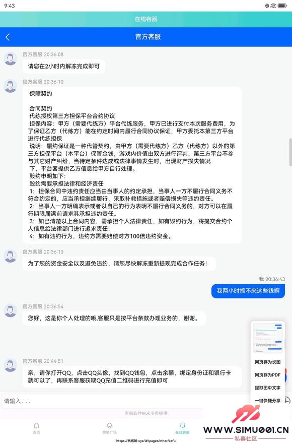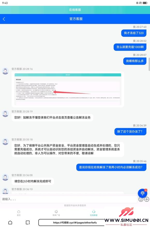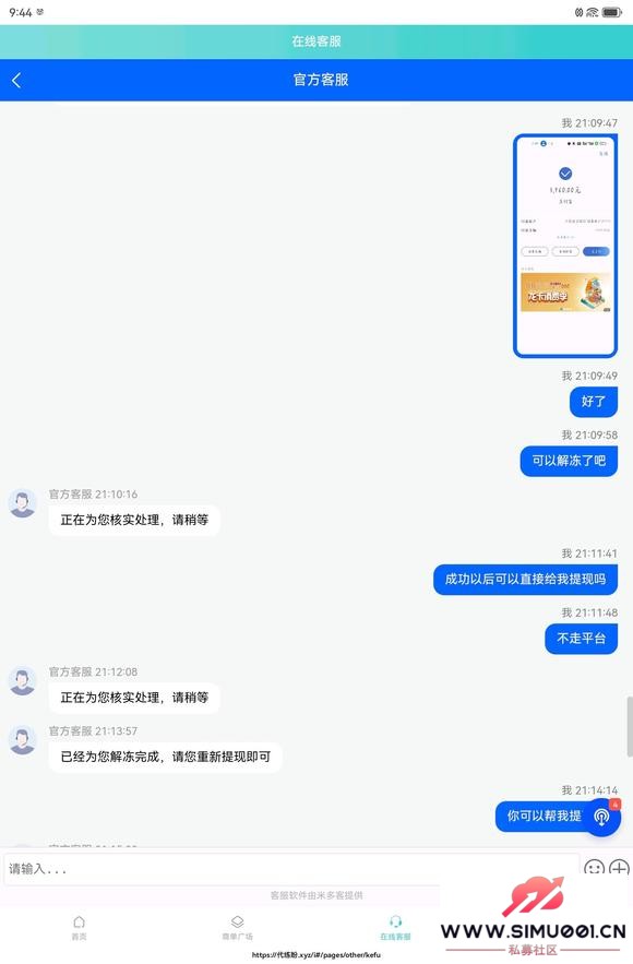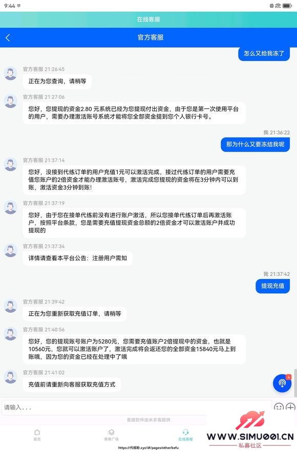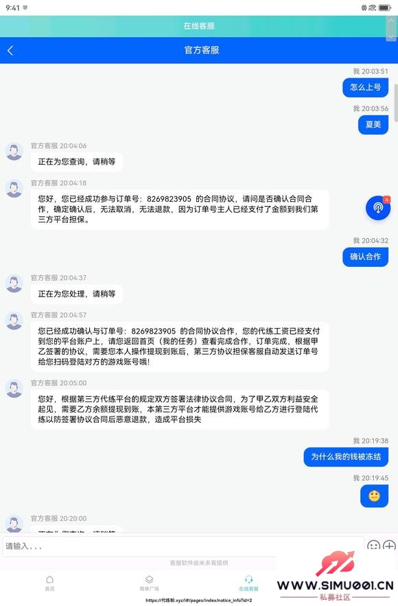 起因是接了个单子(单主)说走平台,就给我了一个网站(代练盼.xyz)这个。进去以后,(单主)说自己把米打到平台里了,(接的是一个月的代跑+任务+红石+光翼+献祭一共是320)(这边也是宣传一下自己)接着说:平台说我得要把钱提现了才能拿到账号,接着我就开始提现。第一次客服说我操作失误,把钱冻结了,然后我就找客服要解冻,说要充1000才可以解冻。充值完以后再提现,又是冻结,完了需要三倍价钱解冻,再充完以后提现,还是被冻结。这时候发现不对劲开始报警,也是很快的赶到,看了以后就说这是纯电诈,是找不回来了,可以立案,但是找不回来,只能是花钱买个教训了。现在钱也是正在冻结,我个人充了有4960,也是找不回来了。现在把这个挂出来也可以提醒一下其他人,别一样被骗了吧。下面把(单主)主页发出来,然后跟客服的发在评论区了。#防诈骗##避雷#( R8 e2 j' X& F5 F* J