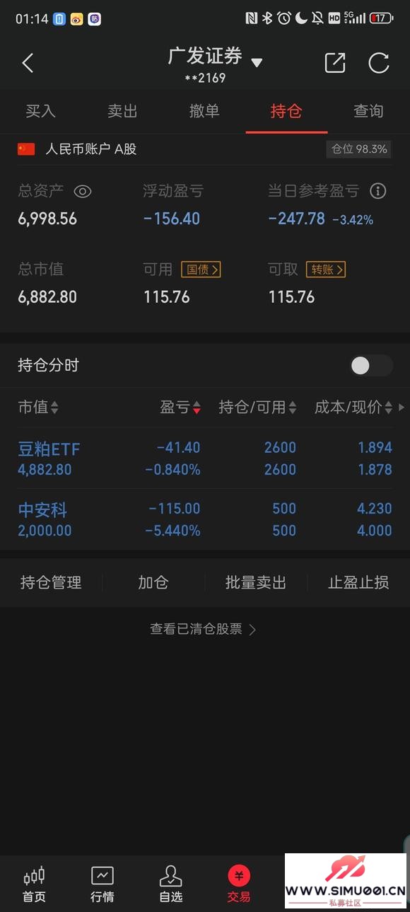 这个月真的非常的惨。。本来上个月月底靠海能达回本了,现在又吐回去了,玩了小半年了,还是没有什么起色,小票小亏,大票大亏。真的好难炒。。总结了一下我之前赚钱的方法,就是追涨杀跌,网上的人总是说这种方法是错的,于是最近我一直在追跌杀涨,可是它们却反而让我大亏。。我周五早上入了中安科和和豆粕,割了江淮汽车和国统股份,这四个票里只有国统让我赚到钱了。最近这种盘面,真是让我意识到了强者恒强,弱者恒弱。。希望周一能给我一条活路。。。我想让我家变得有钱一些。。我想赚钱养我爸妈,养我未来的女朋友。。! s5 o0 R% u+ w* l* M+ T9 o