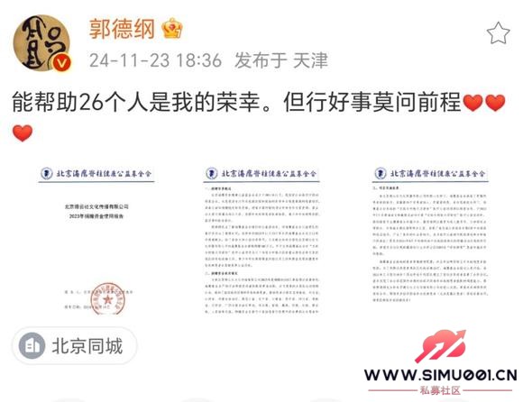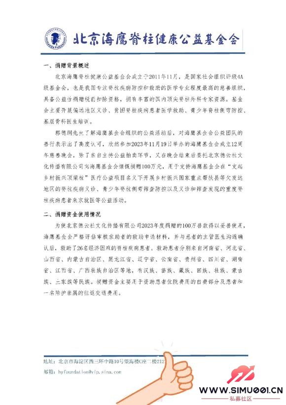 : _5 k. I: s+ l4 }+ k; a% m0 o3 I; \郭德纲先生了解海鹰基金会组织的公益活动后,对海鹰基金会公益团队的善行表示出了高度认可,欣然参加2023年11月19日举办的海鹰基金会成立12周年慈善晚会,又向海鹰基金会慷慨捐赠100万元,用于支持海鹰基金会在“支起乡村振兴顶梁柱”医疗公益项目名义下开展乡村振兴国家重点帮扶县等欠发达地区的脊柱疾病义诊、青少年脊柱侧弯筛查防控以及义诊和筛查发现的重度脊柱疾病患者来京就医等公益活动。' z4 O4 |# a& e% D) i