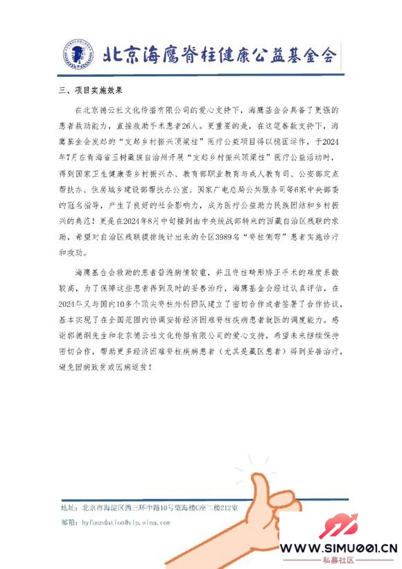 为使北京德云社文化传播有限公司2023年度捐赠的100万善款得以妥善使用, 海鹰基金会严格评估审核求助者的救助申请材料,并与患者的主管医生沟通确认后,救助了26名经济因难的脊疾病患者。