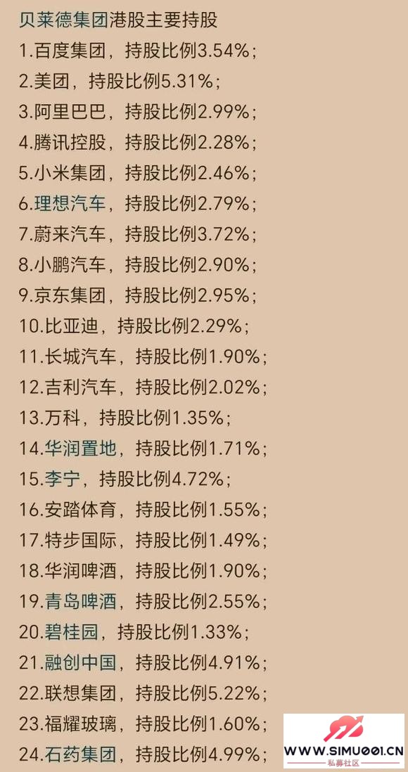 2 N9 a/ Z% f( M b8 f6 Z/ d' A科技互联网:持有百度、美团、阿里巴巴、腾讯、网易、小米的股份,位列不同公司的股东行列。# L( ]" u' h) H/ z