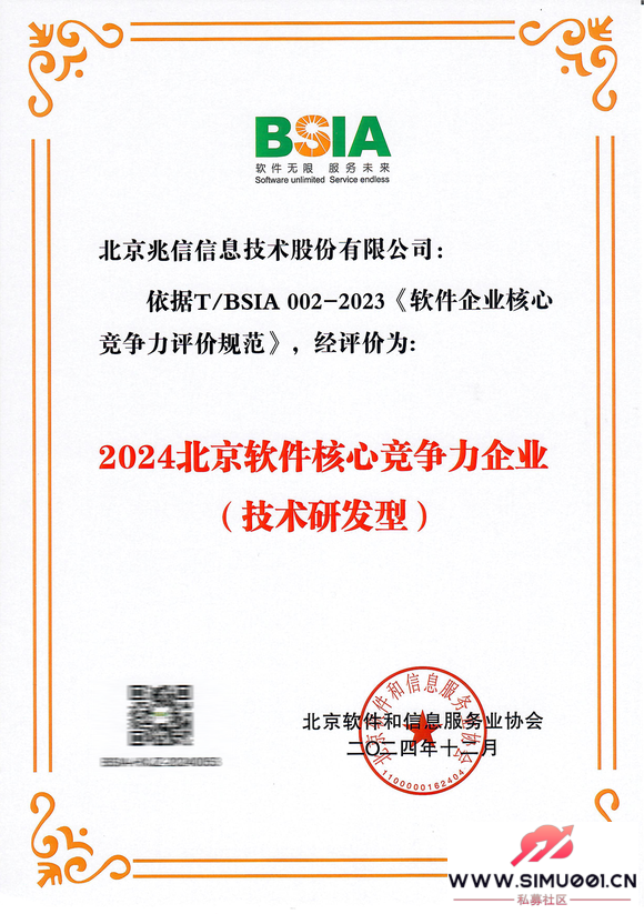 近日,北京软件和信息服务业协会发布《2024北京软件企业核心竞争力评价报告》,评价分为平台赋能型、技术研发型、市场应用型和业务探索型4大类型,每类企业展现出不同的核心竞争力。兆信科技通过类型评估、专家评审等层层筛选,荣登2024北京软件核心竞争力企业(技术研发型)榜单。