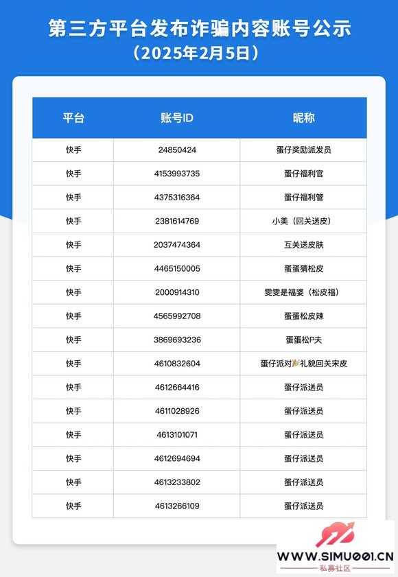 近期有不法分子以“蛋仔派对福利/免费皮肤”等名义通过第三方平台网络直播间、短视频等形式实施诈骗,严重侵害用户利益。《蛋仔派对》项目组已开展7X24小时网络巡查,并将持续向玩家公布疑似诈骗的第三方平台账号信息。以下为2月4日巡查发现的发布诈骗内容账号,所涉违规内容均经举报删除,现公示名单如下:3 f! O% d2 l8 h6 l. U