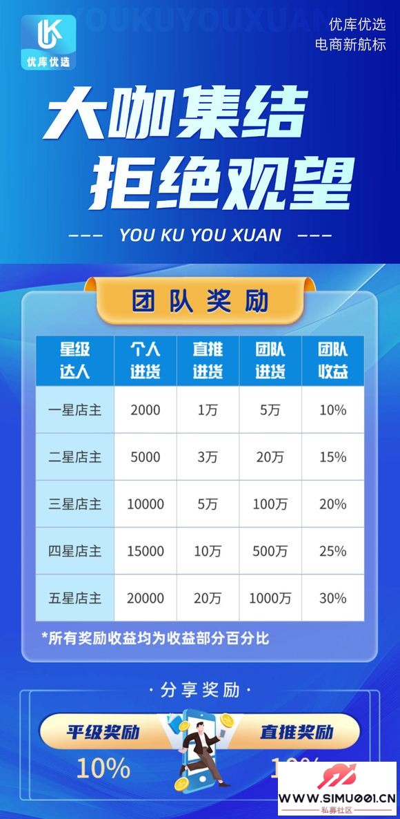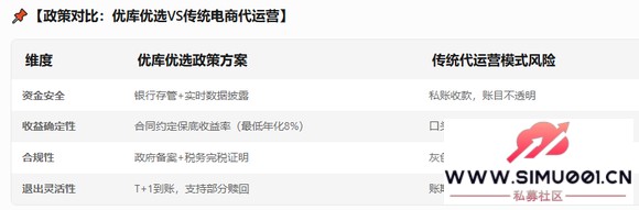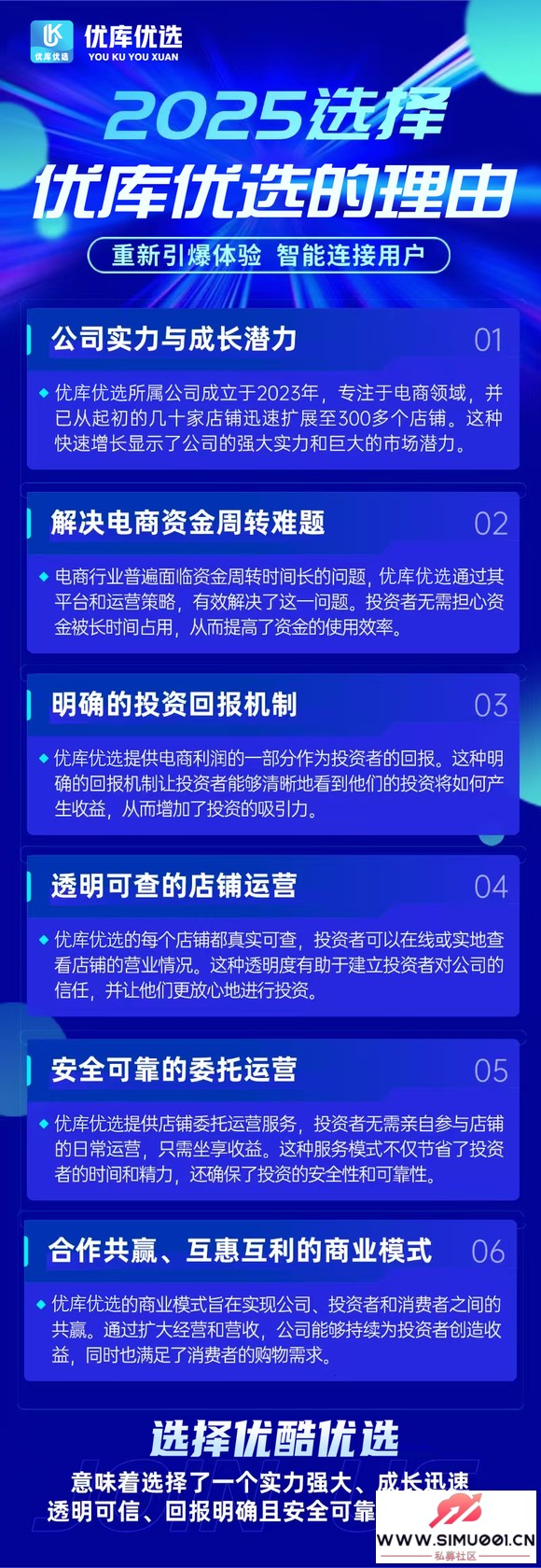 s, o5 j1 q+ f: K- C优库优选作为电商全托管平台,以资金安全、透明运营、回报可量化”为核心,直击传统电商投资三大难题: