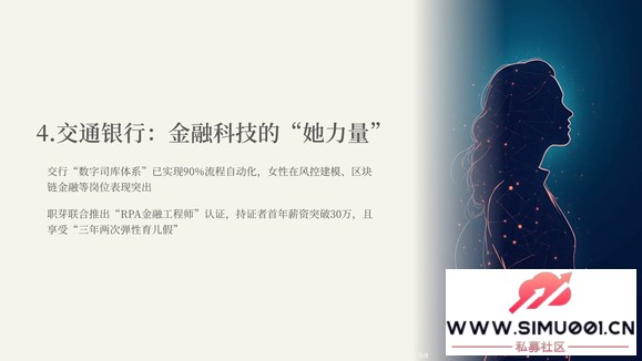 ) S4 f. k0 I+ f) `. `交行“数字司库体系”已实现90%流程自动化,女性在风控建模、区块链金融等岗位表现突出。职芽联合推出“RPA金融工程师”认证,持证者首年薪资突破30万,且享受“三年两次弹性育儿假”。3 k) ?% C+ Z: ~& {# m: l/ V
