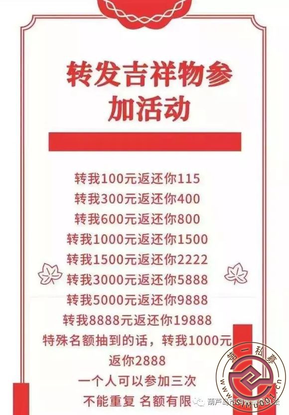 ! }. g. g4 w: t8 X5 W7 i①天下没有免费的午餐,请勿被眼前的暴利所诱惑,不要轻信“高额返利”、“以一返十”等骗局。6 i8 _; T$ s# Q: Y